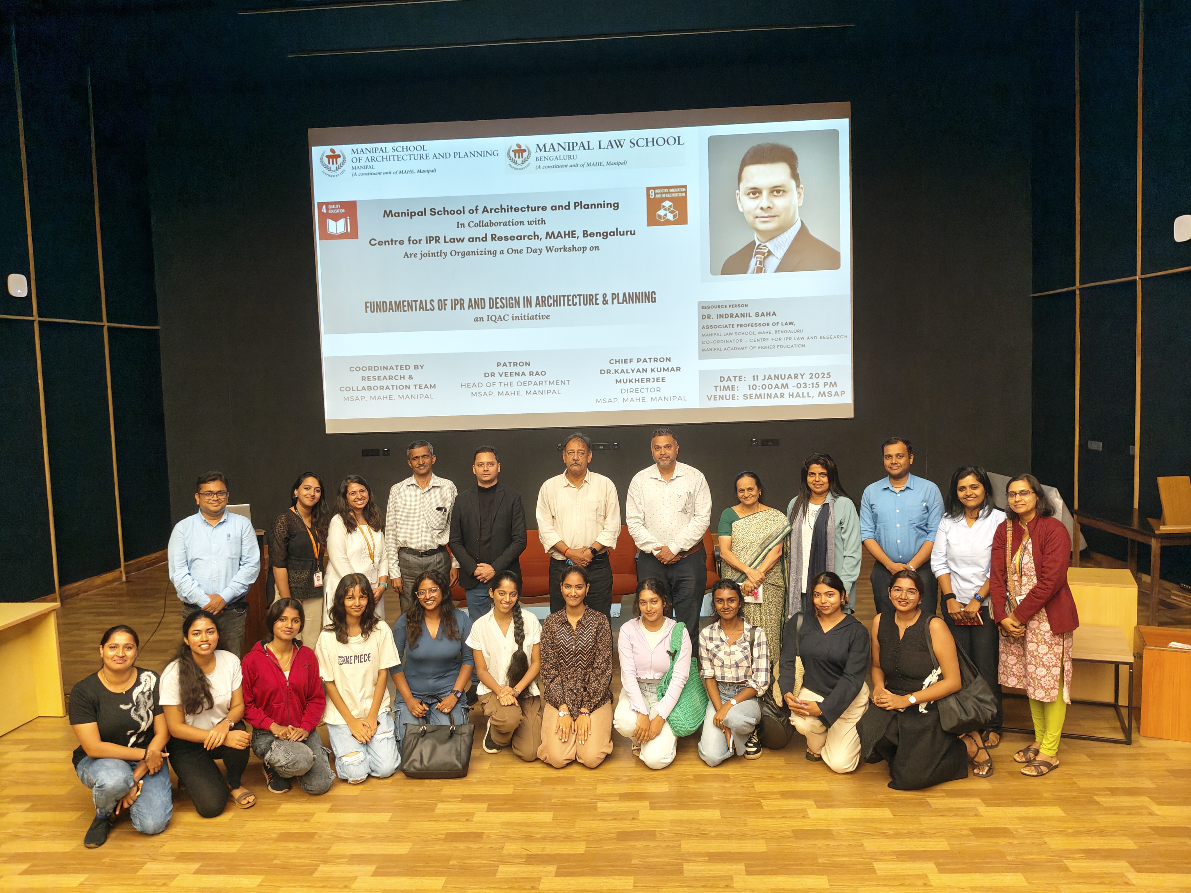 The Manipal School of Architecture and Planning (MSAP), in collaboration with the Centre for IPR Law and Research, MAHE, Bengaluru, successfully conducted a workshop titled "Fundamentals for IPR and Design in Architecture and Planning" on January 11, 2025. This initiative, organized under the aegis of IQAC, was meticulously coordinated by the Research and Collaboration team of MSAP.