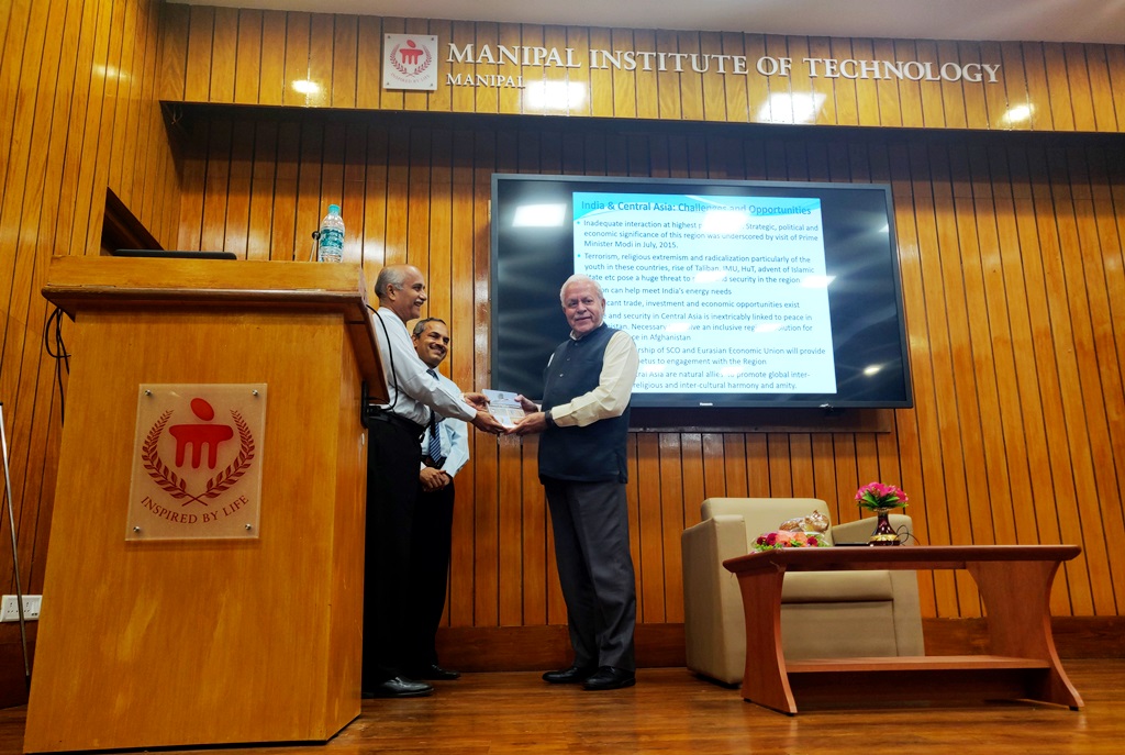 The Department of Geopolitics and International Relations, Manipal Academy of Higher Education (MAHE) in collaboration with Manipal Institute of Technology organised a Distinguished Lecture by Ambassador Ashok Sajjanhar, formerly India’s Ambassador to Kazakhstan, Sweden and Latvia on 7 May 2019. The Ministry of External Affairs, Government of India, has been sponsoring the Distinguished Lecture. The lecture on the theme ‘India and Central Asia: Challenges and Future Prospects’ centred on the geopolitical significance of Central Asia and its relevance for India’s strategic calculations. Ambassador Sajjanhar elaborately discussed the emergence of the Central Asian states as independent entities after the demise of the Soviet Union and the end of the Cold War. The geographical location of the Central Asian countries and its implications for their approach towards connecting to the outside world formed a major part of the lecture. How some of the Central Asian states, despite their landlocked nature, have converted this perceived geographical disadvantage into an opportunity through a network of connectivity projects was explored during the lecture. The richness of these countries in terms of natural resources, including energy resources like uranium and natural gas, and how they affect the foreign relations of these countries was discussed in detail. Ambassador Sajjanhar also dwelt comprehensively on the political contours and the socio-economic indicators the Central Asian states.