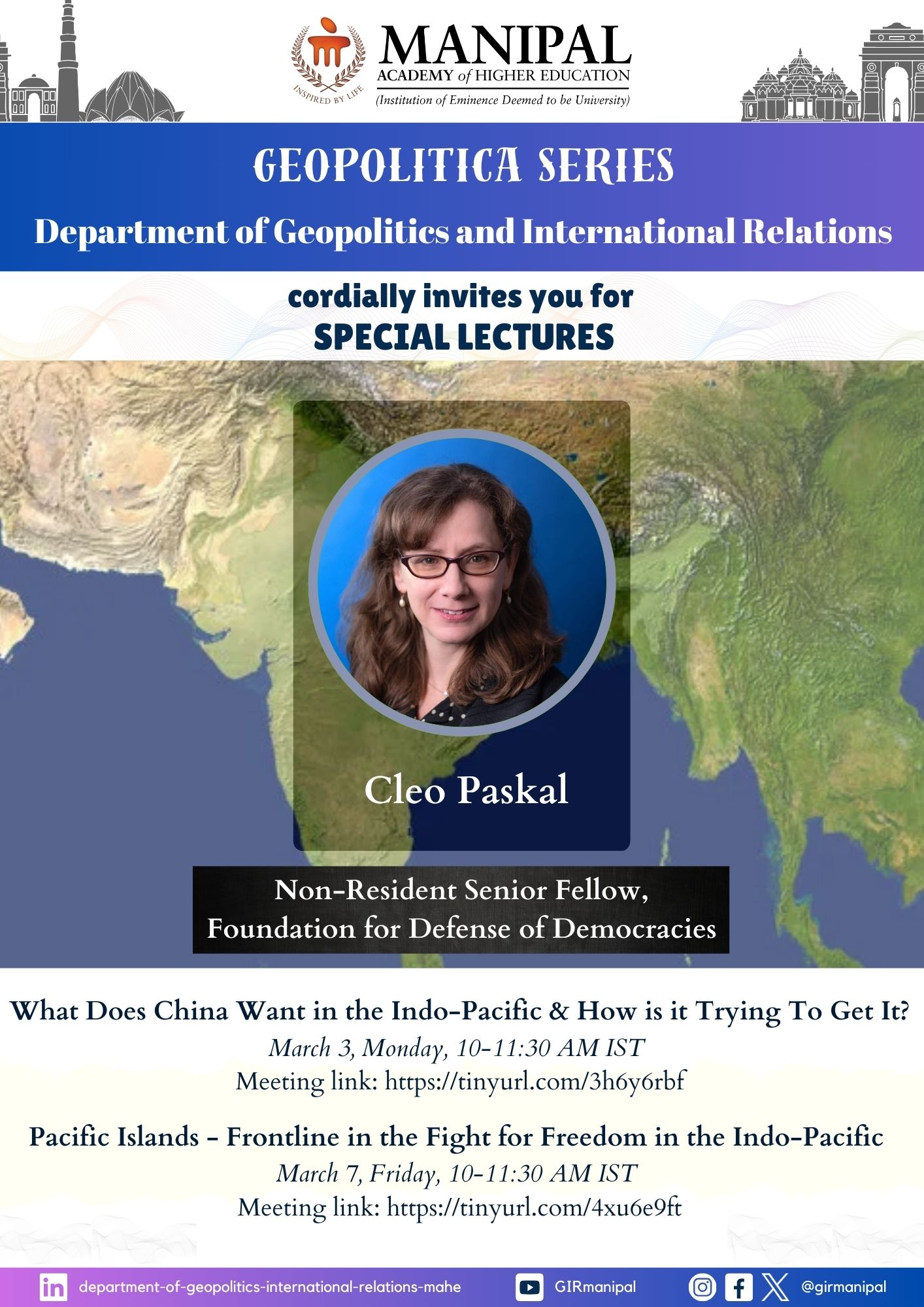 The Department of Geopolitics and International Relations, MAHE organized two special lectures in the virtual mode as part of the GEOPOLITICA series during 3-7 March 2025. The speaker was Cleo Paskal, a Non-Resident Senior Fellow at the Foundation for Defence of Democracies (USA).