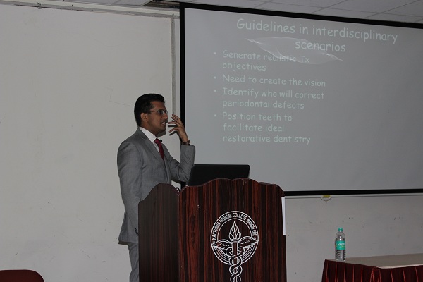 The department of Periodontology conducted the Continuing Professional Development Program titled “Ortho Perio Synergy” on the 22nd September 2018. Dr Biju Thomas, Professor and Head, Dept of Periodontology at AB Shetty Institute of Dental Sciences Mangalore was the chief guest for the event. Dr Dilip G Naik, dean who was present for the event, in his address emphasized the need for adapting an inter disciplinary approach for the treatment of dental problems. Dr Rajaganesh Goutham, who is currently practicing in Pune and an alumnus of the department of Orthodontics MCODS Mangalore was the resource person. He stressed on the importance of the role of a Periodontist in the overall management of an orthodontic patient and also spoke on Periodontally Accelerated Osteogenic Orthodontics (PAOO). The lecture was attended by around 100 participants, including PGs from the department of Periodontics and Orthodontics from colleges in and around Mangalore and interns from our institute.