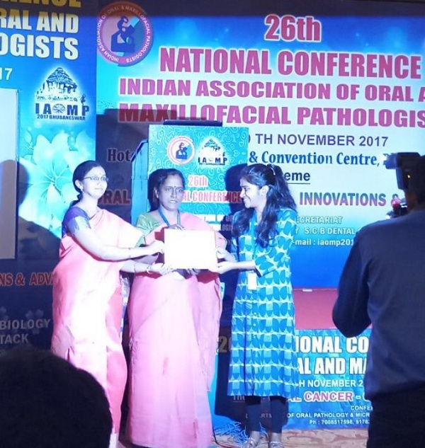 Dr.Nunna Sai Chitra, III year Postgraduate student from the department of Oral Pathology and Microbiology won the best paper award in her session at the XXVI National conference of the Indian Association of Oral and Maxillofacial Pathologist 2017 for her paper titled “Indices for Apoptosis, Mitosis and Turnover: Prognosticators of Oral Squamous Cell Carcinoma”.