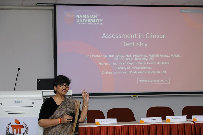 Dr. Pushpanjali,  Professor and head department of Public Health dentistry, Faculty of Dentistry, Ramaiah University, spoke on the topic "Assessment in Clinical Dentistry". She gave clinical demonstrations and conducted an engaing session on the importance of aligning the outcomes/competencies to teaching and assessment. She introduced the gathering to the various criterion involved in developing objective competency-based assessment.