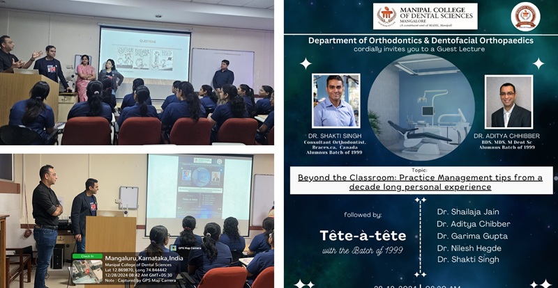 The Department of Orthodontics and Dentofacial Orthopedics, MCODS, Mangalore conducted an alumni Guest Lecture by Dr. Shakti Singh and Dr. Aditya Chhibber (Alumni Batch of 1999) on the topic “Beyond the Classroom: Practice Management tips from a decade long personal experience.” on 28/12/2024. The lecture was followed by a panel discussion with the post-graduates covering various aspects of dental practices in India and internationally. The panel consisted of Alumni of Dept. of Orthodontics, MCODS Mangalore: Dr. Shailaja Jain, Dr. Aditya Chibbar, Dr. Garima Gupta, Dr. Nilesh Hegde and Dr. Shakti Singh.