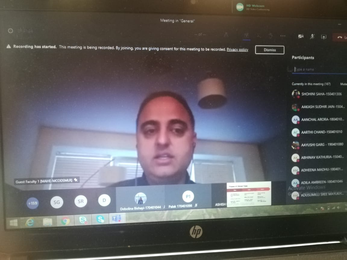 On 1st September, MAHESRF conducted the Season 1 , Episode 2 of the series called WEBISODES. It was a webinar titled-“Insights into Clinical Research” by Dr.Sorabh Kapoor . It was open to students from all the years. With the support of the Dean, Associate Deans, Head of the departments , Staff members and Staff mentors- it was conducted successfully on Microsoft Teams. The event started at 12:15 pm and was attended by approximately 170 participants. Having an experience of more than 19 years in the field of Healthcare which includes an experience of more than 14 years in Clinical research operations, Sir is working as a Senior Startup Critical Path Manager in Ireland. Currently sir is working on the multiple Covid Clinical trials. Sir very systematically and patiently explained the flowchart of the various steps involved in the Research trial and how a drug is released in the market. Each and every step was elaborated and very well explained to ensure that the participants understand it very well. Sir even highlighted about the process to conduct trials during pandemic situations to meet the emergency demands. This was followed by the Q&A session in which students were free to ask questions/doubts. Sir very patiently answered all the questions and made sure that none of the participants had any query unanswered. The welcome address was given by Debolina Bishayi, Joint Secretary -MAHESRF and the event was moderated by Dr Aakash Jain-Secretary , MAHESRF. The event got over by 2:00 pm and the participants were satisfied and had positive reviews for the event.