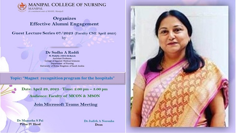 An alumni engagement guest lecture series – 07/2023, was organized by the Pillar IV team on the topic ‘Magnet recognition program for the hospitals’ on 29 April 2023 from 2 pm to 3 pm. Dr. Sudha A Raddi, an alumnus of MCON, Assistant Professor, College of Applied Medical Sciences, Department of Nursing, University of Bisha, Kingdom of Saudi Arabia was the speaker. Dr. Sudha explained the purposes and importance of magnet recognition and elaborated on the models. She added that achieving magnet recognition is an honor for the nursing profession and with this recognition, the hospitals are able to attract skilled nurses and achieve superior clinical outcomes. A total of 52 faculty and 12 PhD scholars attended the session.