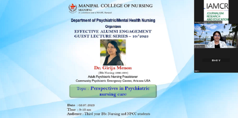 An alumni guest lecture was arranged by the Department of Psychiatric (Mental Health) Nursing, Manipal College of Nursing (MCON), MAHE, Manipal for the UG and PG nursing students on 3rd July 2023 through online mode. The resource person was Dr Girija Menon, Independent Psychiatric Nurse Practitioner working at Community Psychiatric Emergency Centre, Arizona, USA. She is an alumna of MCON, MAHE, Manipal: BSc (N) 1990-1994 batch. Dr Menon deliberated a session on “Perspectives of psychiatric nursing". She discussed the scope of psychiatric nursing in USA and provided a few glimpses of her professional journey. A total of 105 participants (students from 3rd year BSc, and 1st yr MSc Nursing) attended the session.