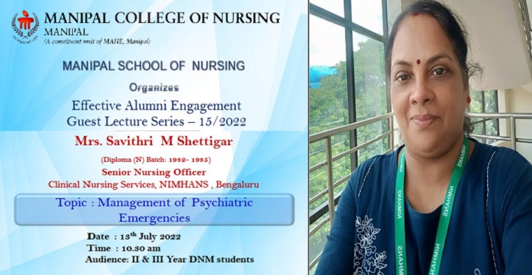 Manipal School of Nursing, MCON, MAHE, Manipal had organized a guest lecture on the topic “Management of Psychiatric Emergencies” by Mrs. Savitha Shettigar, Senior Nursing Officer, Clinical Nursing Services, NIMHANS, Bengaluru on 13th July 2022 at 10.30 am.