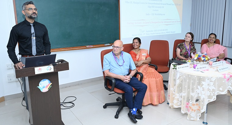 Manipal College of Nursing in collaboration with the Interprofessional Advanced Wound Care Centre, Centre for Continuing Education, and Interprofessional Development Department, MAHE Manipal, and Edge Hill University UK jointly organized a day workshop on empowering carers for advanced home care under SDG 3 Good Health and Well-Being. Dr. Judith A. Noronha, Dean College of Nursing has stressed the importance of an advanced home care workforce to meet the rising demands. Dr Vimal Krishnan, Chief Guest of the day addressed the August gathering focusing on caring for advanced care at home that can be indeed challenging. When someone requires advanced medical care or has complex healthcare needs, providing care in a home setting comes with its own set of difficulties and considerations. The caregivers and families may encounter numerous challenges when caring for advanced medical needs at home. Dr Elsa Sanatombi Devi shared glimpses of Interprofessional Advanced Wound Care Centre activities which is an industry-collaborated center of MAHE Manipal dedicated to training and capacity building of health care professionals as well as caregivers. Caring to care and having to die a dignified death is the dream of every human being. Loving and empathetic care is our goal to reduce abuse and neglect while caring. Building capacity to care can reduce abuse to a great extent in our society. Patients today are going home with complex medical procedures, multiple medications, and 24/7 Care, which can be emotionally and psychologically exhausting. Therefore, helping them cope with a loved one's serious illness can be emotionally draining as well. Providing emotional support and maintaining a positive atmosphere at home is crucial for both the patient and the caregiver. Dr Toni Bewley and Dr Allen Bewley, Edge Hill University shared their views on her passionate care given for her own daughter with a chronic health problem and also her mother-in-law who had dementia. She highlighted the home modifications to accommodate medical equipment and ensure the patient's safety and mobility. These modifications can be costly and time-consuming as well. Dr Suba Sooria, Head of Nursing, at Kasturba Hospital, addressed her views on training the trainer's program for advanced home care to coordinate with the wound center and cater to the needs of the elderly or chronic home-bound individuals and make a registry for elderly for continual support as an administrator. Caregiver Burnout is vividly seen on the surface which can induce elderly abuse and neglect besides caring for them towards their end of life which can be deeply emotional and challenging. This challenge is an opportunity for healthcare professionals to offer a wide range of positive facilities. Additionally, having a well-thought-out care plan, involving the patient in decision-making, and maintaining open communication with healthcare providers can help improve the quality of care provided at home. Dr Elsa Sanatombi Devi shared her expertise on diabetic foot debridement using simulation as a method of learning to learn. Preparing carers for advanced home care needs competency towards advanced care techniques. Mr Prasannakumara, a nurse practitioner demonstrated pressure ulcer care. Ms. Effienia D Walling, Ms Priyanka Mukherjee, Ms. Pushpavathi, Mr Shreenidhi, Mrs Janet Alva, Asst Professor, demonstrated surgical wounds, LAD therapy, episiotomy wound and Burns wound care. A total of 40 participants from Nursing, Medicine, Public health, Engineering, and Edge Hill graduates actively engaged in the sessions.