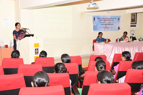 An informative session on ‘nurses roles and responsibilities in care of children with cancer’ by Mrs. Anjalin D’souza, Asst Professor, Dept. of Child Health Nursing, MCON, Manipal. She discussed the important care aspects for children diagnosed with cancer, mainly focussing on the nursing care precautions to be taken during administration of chemotherapeutic agents. All the sessions of the seminar focussed on the treatment modalities and highlighting the role of health care providers in meeting the challenges faced in care of paediatric cancer patients. A total of 89 participants which included students and faculty from Udupi and Manipal were registered for the seminar.