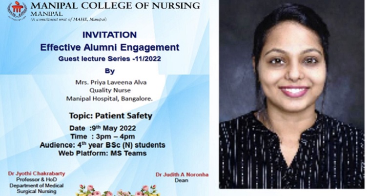 Department of Medical-Surgical Nursing, Manipal College of Nursing, Manipal organized a Guest Lecture on “Patient Safety” on May 09, 2022, between 3.00 pm to 4.00 pm to IV year BSc Nursing Internship students through blended mode. Mrs. Priya Laveena Alva, Quality Nurse, Manipal Hospital, Bangalore addressed on the topic. The session highlighted on the causes of patient harm, preventive aspects, key actions, safety goals and nurse responsibilities. A total of 98 participants including IV year BSc Nursing Internship students and faculty members of the college participated in the session.