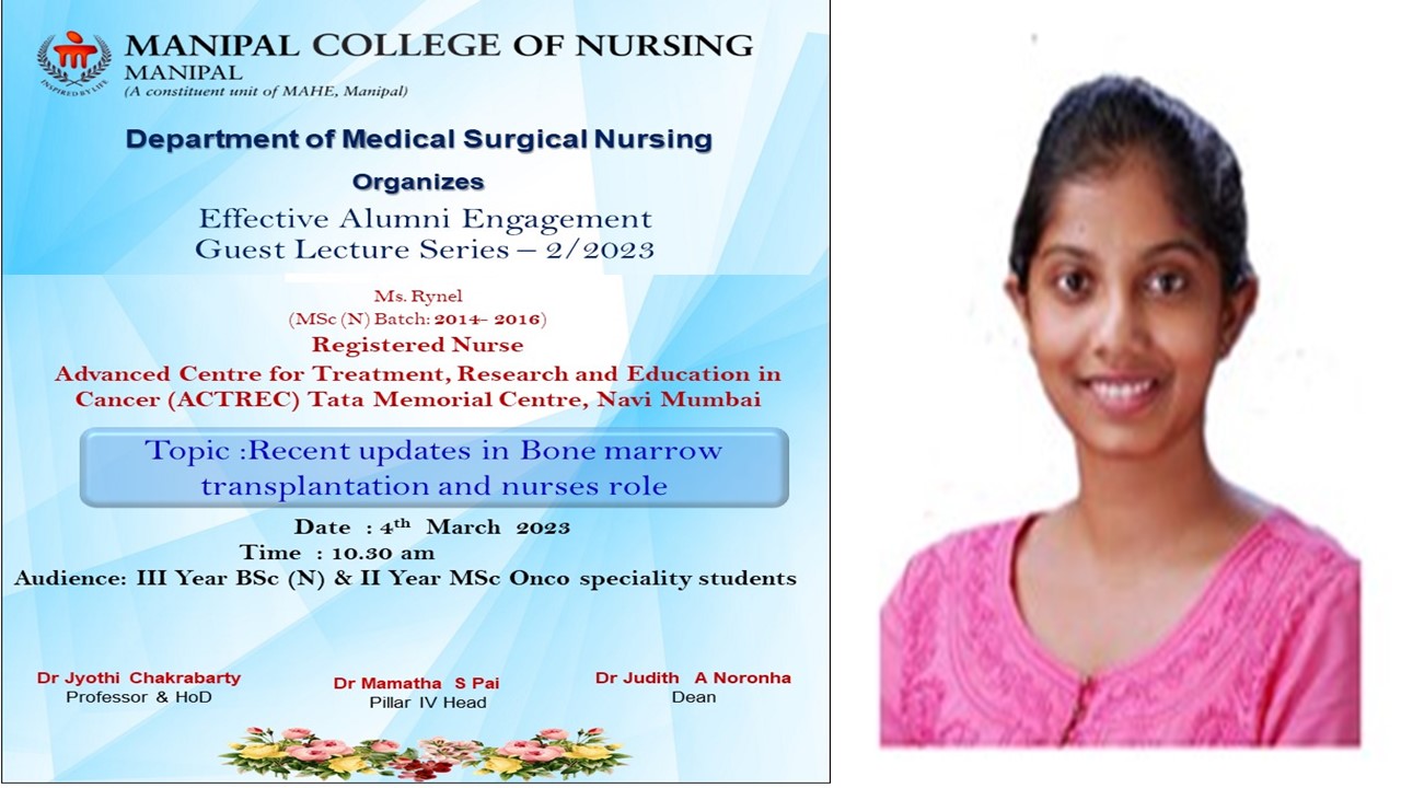 Department of Medical-Surgical Nursing, Manipal College of Nursing, Manipal organized an effective alumni engagement Guest Lecture series on “Recent updates in Bone marrow transplantation and nurse’s role” on March 04, 2023, between 10.30 am & 11.30 am to 3rd year BSc Nursing and 2nd year MSc Nursing Onco speciality students through Microsoft Teams Platform. Ms Rynal Desma Quadras (MSc (N) Batch: 2014- 2016) Registered Nurse, Advanced Centre for Treatment, Research and Education in Cancer (ACTREC) Tata Memorial Centre, Navi Mumbai spoke on the topic. She spoke on types, preparation of patients, the process of a bone marrow transplant, infection control measures in the bone marrow unit, complications, recent advances in bone marrow transplant and the roles and responsibilities of nurses in taking care of patients undergoing bone marrow transplant. She also gave information about the role of nurses in the bone marrow transplant unit at the Advanced Centre for Treatment, Research and Education in Cancer (ACTREC) Tata Memorial Centre, Navi Mumbai. A total of 109 participants including students of 3rd year B.Sc (N), 2nd year MSc (N) Oncology nursing and faculty members of the college participated in the session.