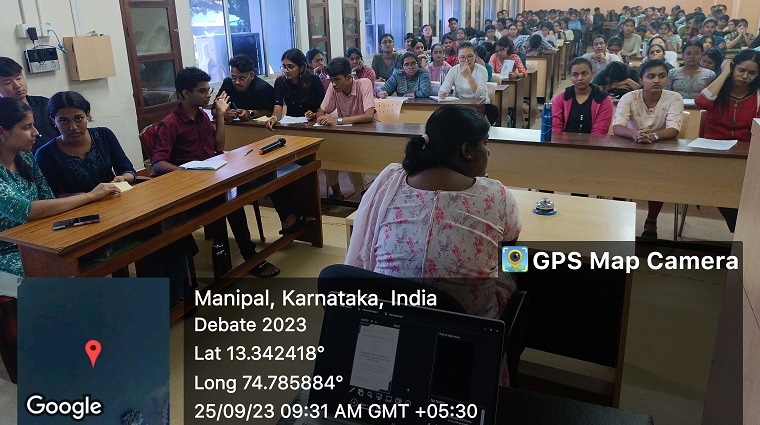 The Department of Fundamentals of Nursing organized a debate for First Semester BSc Nursing students to ignite thinking among the students, a teaching-learning method. The debate was conducted on September 25, 2023, at 9:00 AM on the topic “Is professional conduct vital for nursing students to provide patient care.” There were a total of five teams comprising three members in each. Three teams spoke for the topic, and the remaining two teams against the topic. They justified their viewpoints on professional conduct by giving clinical-oriented examples. The teams argued that the professional conduct among nursing students in clinical settings was as vital as the education and skills required by a student nurse. The students gave relevant examples and scenarios during which a student nurse must choose between the conduct and skills to be provided and the result of the same. In the end, the team, along with the audience, concluded that imbibing the skills and knowledge in hand with professional conduct can make a student nurse more efficient when providing clinical care to patients. The roots that germinate from the beginning as a student nurse can grow into a strong tree when they become a fully pledged nurse with skills and appropriate conduct. The audience at the end provided good feedback. A total of 123 students were present during the debate, including 16 male students and 107 female students. This activity was in line with Sustainable Development Goal 4: Quality Education.