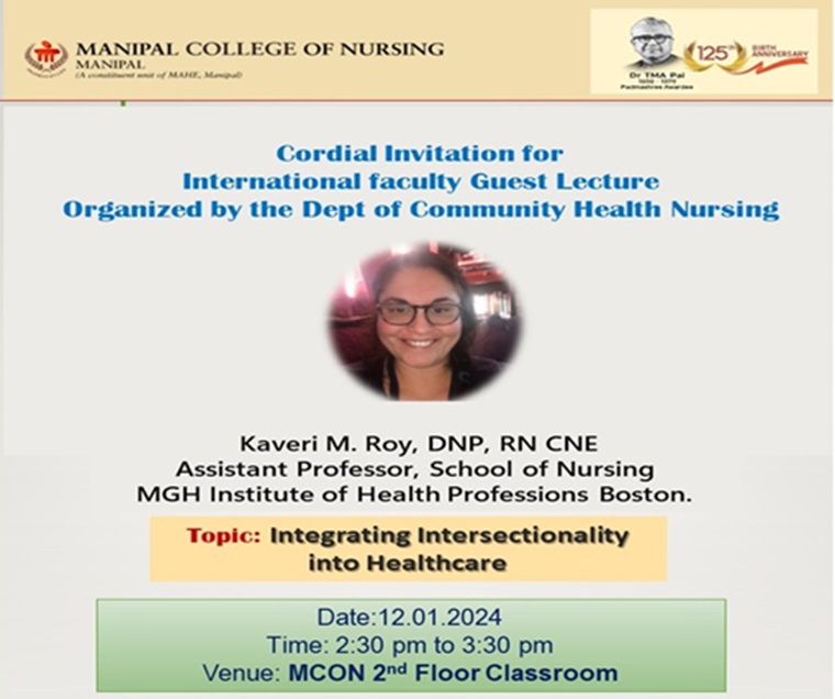 Six students of MGH Institute of Health Professions, Boston visited Manipal College of Nursing, MAHE Manipal, from January 2 to January 24, 2024. The students were accompanied by Dr. Elissa Ladd and Dr. Kaveri Roy from the MGH Institute of Health Professions. The students were provided various experiences at Hombelaku, psychiatric rehabilitation, psychiatric wards, critical care units, emergency units, antenatal, and postnatal areas, infertility clinics of pediatric wards, NICU, Access Life Assistance Foundation, Ayurveda, and yoga departments of Kasturba Hospital. Students were also given the experience of community settings, including the Primary Health Center and Anganwadi Center. Dr. Elissa Ladd and Dr. Kaveri Roy were involved in the various academic programs during the visit, which included the symposium on wound care, the National Conference of MCON 2024, and a guest lecture on integrating intersectionality in nursing education. This program was coordinated under the guidance of Dr Judith A. Noronha, Dean Manipal College of Nursing, by the Team Internationalization of MCON, comprising Dr. Elsa Sanatombi Devi, Dr Shashidhara YN, Mrs. Sweety Fernandes, Dr Jyothi Chakrabarty, Mrs Asha K. Nayak, Dr. Sushmitha Karkada, Dr. Sangeetha Priyadarshini, and Dr Malathi G Nayak. The students and the faculty have given good feedback on the entire programme.
