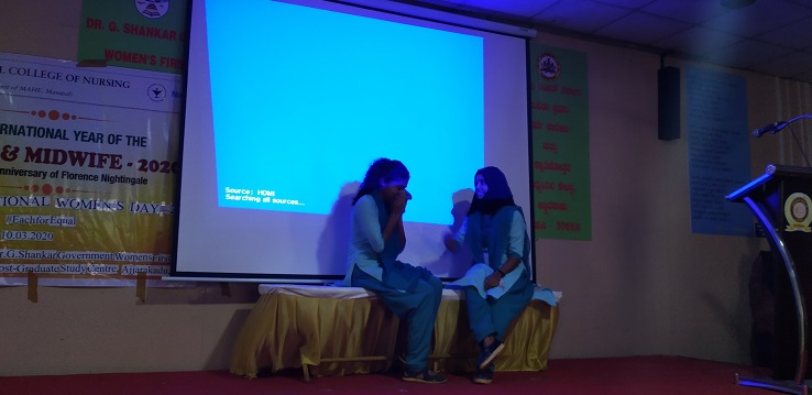 The faculty members of the Department of Obstetrics and Gynecological Nursing, Manipal College of Nursing, Manipal Academy of Higher Education (MAHE), Manipal in collaboration observed International Women's Day on March 10, 2020. Two awareness programs on the theme #Each for equal were conducted with a self-help group of Stree Shakthi, 80 Badagabettu and Dr. G. Shankar Government Women's First Grade College and Post-Graduate Study Centre Ajjarkad, Udupi.
