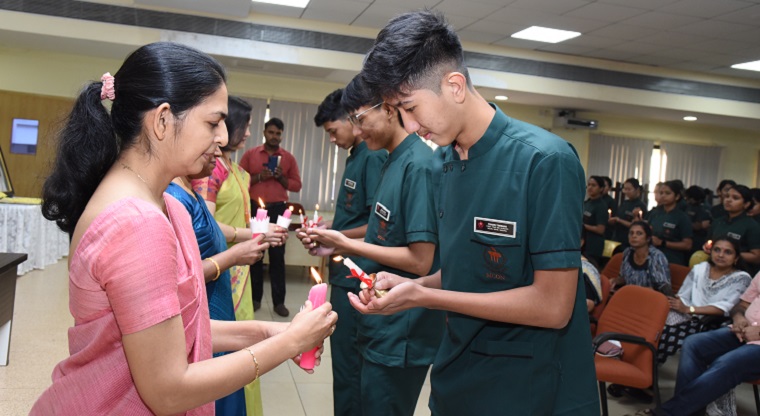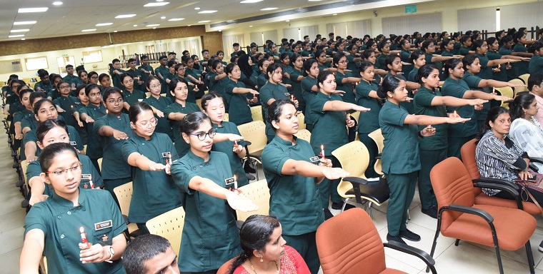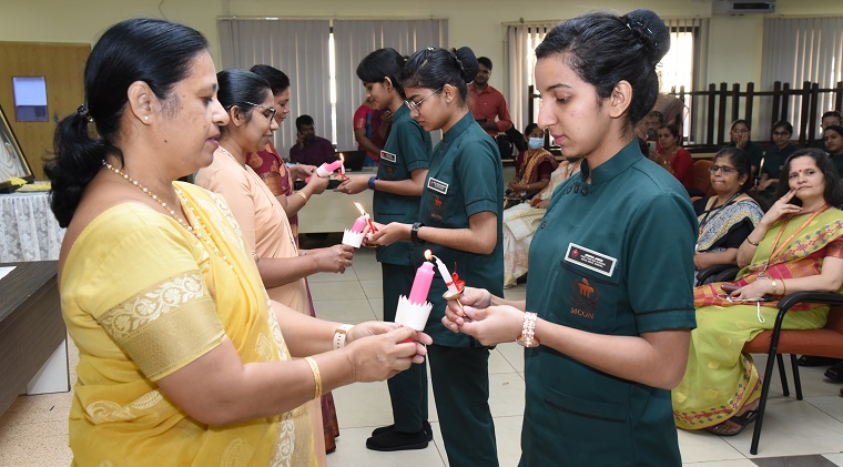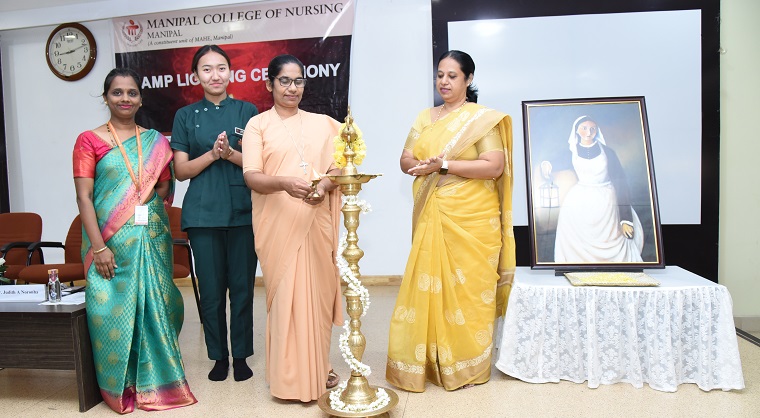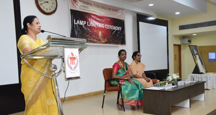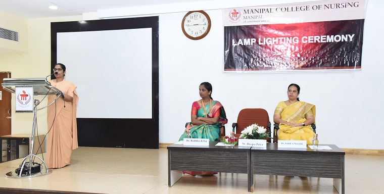 The lamp lighting ceremony for the 33rd batch of BSc Nursing students of Manipal College of Nursing, MAHE, Manipal was held on 9th November 2022 at Dr TMA Pai Hall, KMC, Manipal. Novice student nurses are formally inducted into the nursing profession through a lamplighting ceremony. Student nurses took the oath to discharge their duties with complete honesty, integrity, and no discrimination. It is an important event, where the lamp symbolizes the light that a nurse becomes to her patients as a symbol of hope and comfort to those who are suffering. A total of 140 students of first semester BSc Nursing received the light from the Chief Guest, Sr. Deepa Peter, Principal, Athena College of Nursing, Mangalore, Dr Judith A. Noronha, Dean, Dr. Tessy Treesa Jose, Associate Dean, Dr Linu Sara George, Professor, Dr. Baby S Nayak, Professor, Manipal College of Nursing, Manipal and Dr. P Suba Sooria, Head of Nursing Services, Kasturba Hospital Manipal. This was followed by the oath-taking ceremony of the novice nurses. Chief Guest, Sr. Deepa Peter, in her address to the gathering congratulated the students for choosing the nursing profession and emphasized the importance of patient care and satisfaction. She said, in her experience how she felt entering the noble nursing profession. Every nurse should help and take care of needy people by giving selfless care. She stressed that the nursing profession involves human connection which touches the life of the people. Dr Judith A. Noronha, the Dean, spoke on the significance of lamp lighting and various qualities that a student nurse needs to instil in her/his clinical practice. She emphasized developing curiosity, humility, and passion for the care of the patients. She further stressed developing selfless service that every nurse should render by adding a good attitude and passionate care
