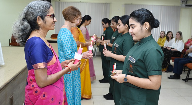The lamp lighting ceremony for the 34th batch of BSc Nursing students of Manipal College of Nursing, MAHE, Manipal, was held on 27th September 2023 at Dr TMA Pai Hall, II Floor, KMC, Manipal. The program began by invoking God’s blessings with a prayer song. The esteemed guests present were Dr. Toni Bewley, Program Lead & Senior Learning and Teaching Fellow, Edge Hill University, UK, and an Adjunct faculty MCON, MAHE, Manipal, and Dr. P Giridhar Kini, Registrar, Manipal Academy of Higher Education. Mrs. Charlet Vaz, Class Coordinator, delivered the welcome address and introduced the chief guest, followed by ceremonial lighting and a floral tribute to the portrait of Florence Nightingale by the dignitaries on the dais. The chief guest, Dr. Toni Bewley, congratulated the students for choosing the nursing profession and emphasized the caring aspects of nursing and the journey of Florence Nightingale to the budding nurses. She said as we go through the journey as nurses, we face many challenges, and it's our responsibility to keep the patients first. The students were told to make a positive difference in the patients' lives. Dr. P. Giridhar Kini, Registrar of MAHE in his address highlighted the importance of discipline, attendance, internal assessment of marks, application of learning, setting priorities, maturity, social media influence, time management, being healthy, and enjoying the challenges they face in this academic journey. The lamp lighting ceremony, as a symbol of initiation to the nursing profession was given to a total of 139 students of first semester BSc Nursing students. They received the light from the Chief Guest Dr. Toni Bewley, Dr. Judith A. Noronha, Dean, Dr. Linu Sara George, Professor & HoD, Fundamentals of Nursing and Dr. Jyothi Chakrabarty, Professor & HoD, Medical Surgical Nursing. This was followed by the oath-taking ceremony where the student nurses took the oath to discharge their duties with complete honesty, integrity, and no discrimination. Ms. Mitchell Shilpa Lewis, Lecturer, Department of Fundamentals of Nursing compered the event.
