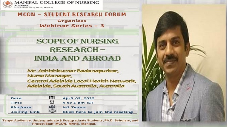 Manipal College of Nursing - Student Research Forum, MAHE, Manipal, organized the third session of the year-long webinar series on ‘Scope of nursing research - India and abroad’ on 9th April 2022, from 4 pm to 5 pm. The resource person for the session was Mr Ashishkumar Badanapurkar, Nurse Manager, Central Adelaide Local Health Network, South Australia, Australia.