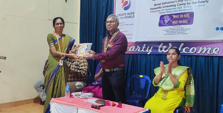 Department of Psychiatric (Mental Health) Nursing, MCON, MAHE, Manipal and the Department of Psychiatry, KMC, MAHE, Manipal jointly organised a Dementia screening camp at Rotary Hall, Shankarpura in collaboration with Rotary Club Shankarpura, Department of Student Affairs, MAHE, Manipal, Primary Health Centre, Moodabettu, St. Johns Church, Shankarpura, and CSI Christha Mahima Church, Manipura. This year's theme for Alzheimer’s Day is “Never too early, Never too late," which underlines not only the essential role of Alzheimer's disease risk factors identification but also the implementation of proactive risk reduction measures to hamper and, if possible, prevent the onset of dementia. The program was presided over by Rtn George D’silva, President, Rotary Club Shankarpura, and the chief guest was Dr Geetha Maiya, Director, Student Affairs, MAHE. Rtn Chandra Poojary, Zonal Lieutenant, Rotary Club Shanakarpura and Mr Sandesh, Community Health Officer, Subasnagara, have also participated in the program. Dr Rashmi and Dr Aravind Pandey, Deputy Directors, Student Affairs, MAHE, were also present. The program is aimed to achieve the sustainable development goal No three (SDG 3) To sensitise the general public about Dementia, Dr Rajeshkrishna Bhandary, Associate Professor, Department of Psychiatry, KMC Manipal, took an awareness session on “Early intervention in Dementia”, and Mrs Asha K Nayak, Assistant Professor, MCON, MAHE Manipal, highlighted the topic “Caring for the person with Dementia”. Dr Rajeshkrishna Bhandary, Associate Professor and Dr Abhiram, Assistant Professor, Department of Psychiatry, KMC, Manipal conducted the screening camp. Mr Roshan David Jathana, Dr Rayan Mathias, and Mr Jeevan Lewis, Student counsellors, MAHE coordinated and managed the participants for the screening camp. Sixty members participated in the program and Forty-one elderly were screened for Dementia. The camp aims to screen the elderly to identify the risk factors for Dementia. People at risk were referred to hospitals for specialised care. The overall program was coordinated by Dr Binil V, Additional Professor and Mr Renjulal Yesodharan, Assistant Professor, Department of Psychiatric Nursing, MCON, MAHE, Manipal.