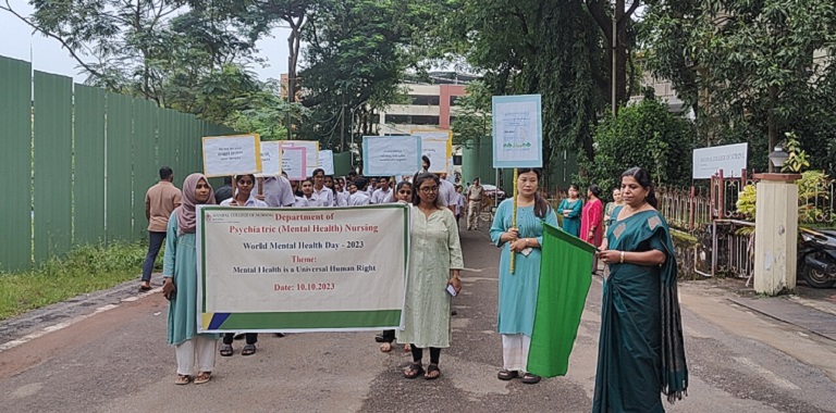 As part of creating awareness among the public on the day and theme a ‘Memory walk’ was organised on 9th Oct 2023. Dr. Tessy Treesa Jose, Associate Dean and HoD, Psychiatric (Mental Health) Nursing highlighted the significance of observing World Mental Health Day. She flagged off the memory walk. The faculty, research scholars and students from 2nd year MSc(N) speciality, II Year PBBSc (N) and 3rd year BSc(N) participated in the programme.