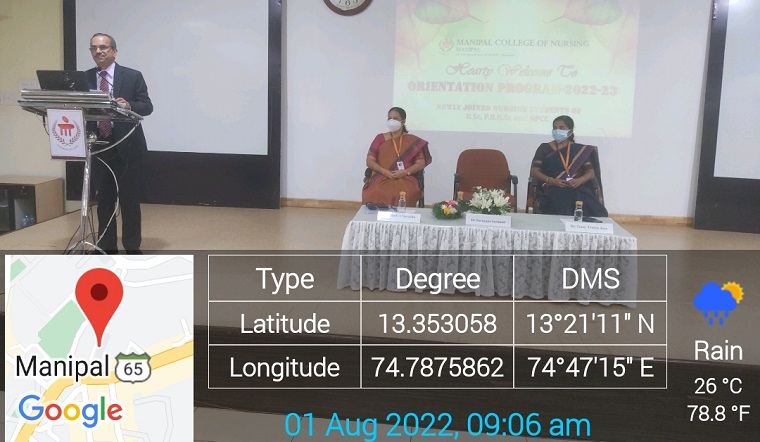 Freshers’ Orientation program of 32nd Batch of BSc Nursing, 28th Batch of PBBSc Nursing, and 6th Batch of NPCC Nursing was organized by Manipal College of Nursing, MAHE, Manipal on 1st August 2022 at the Dr. TMA Pai Hall I, KMC, Manipal. The Chief Guest of the program, Dr. Narayana Sabhahit, Registrar, Manipal Academy of Higher Education (MAHE), Manipal addressed the newly joined students and their parents. He gave a brief orientation about MAHE including the various opportunities available to join open elective courses. In his address to the students, he briefed them on the importance of setting goals for learning as well as the core values to be followed for academic achievement. Dr. Judith A Noronha, Dean, MCON Manipal gave a brief introduction of the institution and introduced the faculty members. Orientation to the Nursing Services department of Kasturba Hospital, Manipal was given by Mrs. Charmaine Crystal Salins, Nurse Training and Quality In-charge, Kasturba Hospital, Manipal. Orientation to student support services offered by MAHE was explained by Dr. Geetha Maiya, Director Student Affairs (DSA). The various services offered by MAHE were briefed by Dr. Tessy Treesa Jose, Associate Dean, MCON, Manipal.