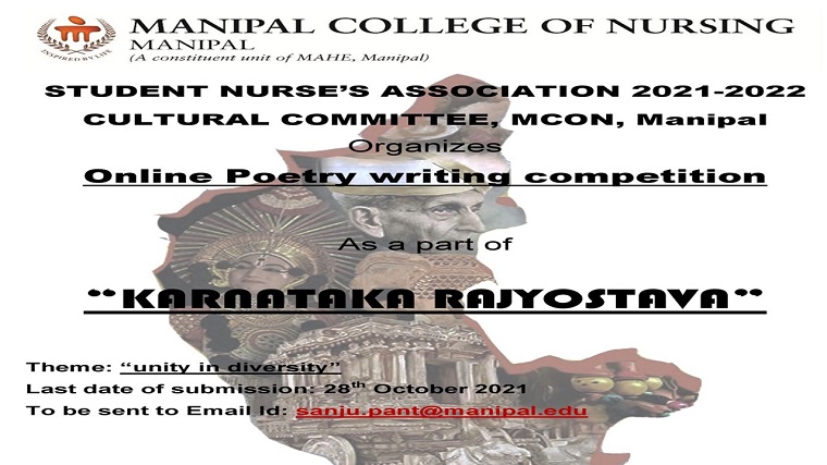 As part of Karnataka Rajyotsava, the cultural committee of Student Nurses' Association, Manipal College of Nursing, MAHE, Manipal organised an “online poetry writing competition” on 2nd November 2021 through online mode. A total of six participants were present. The theme was “unity in diversity”. The competition was held under the supervision of Cultural committee advisor Ms Sanju Pant and cultural Chairperson Ms Navya.