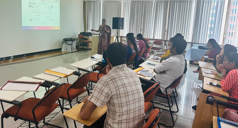 The second day’s session began with Dr. Vimal Krishnan, Additional Professor, Department of Emergency Medicine, KMC Manipal, on the topic of trauma assessment. He led an engaging and dynamic session, seamlessly integrating theoretical concepts with practical, scenario-based learning. Ms. Teena Sharon, Nurse Practitioner in Critical Care, Kasturba Hospital, Manipal, presented a detailed session on organ transplantation, including the medical procedures, ethical considerations and patient care. A session on POCUS for shock was presented by Dr. Vishal Shanbhag, Associate Professor, Department of Critical Care Medicine, KMC Manipal, with several real-life examples suggesting that it provides valuable knowledge and practical insights into using ultrasound technology to diagnose and manage shock effectively. Another experiential session on ICD insertion was done by him to enhance the skills of the participants. In the afternoon, workstations on ultrasound simulation, ECG interpretation, drug calculation, and chest x-ray interpretation were conducted by Dr Vishal Shanbhag, Associate Professor, Department of Critical Care Medicine, KMC Manipal, Dr Melita Sheilini, Associate Professor, MCON Manipal, Dr. Soumya Christabel, Assistant Professor (Sr scale), MCON Manipal; and Dr. Shalini G. Nayak, Assistant Professor (Sr scale), MCON Manipal, respectively.