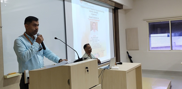 As part of the Deeksharambha orientation program, the Department of Medical-Surgical Nursing at Manipal College of Nursing, MAHE, Manipal, hosted an engaging guest lecture titled "Love and Gratitude" on August 8, 2024. Starting at 11:30 am, the one-hour session was designed for first-semester BSc Nursing students. Mr. Jeevan Lewis, Student Counselor at the Department of Student Affairs, MAHE, Manipal, led the session, emphasising the significance and benefits of love and gratitude in personal and professional realms.