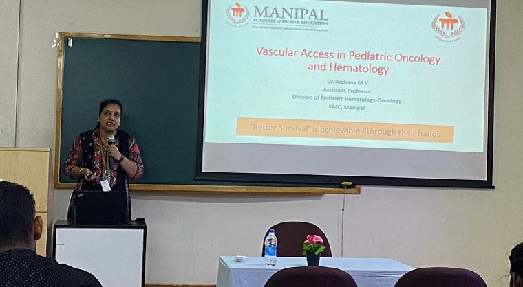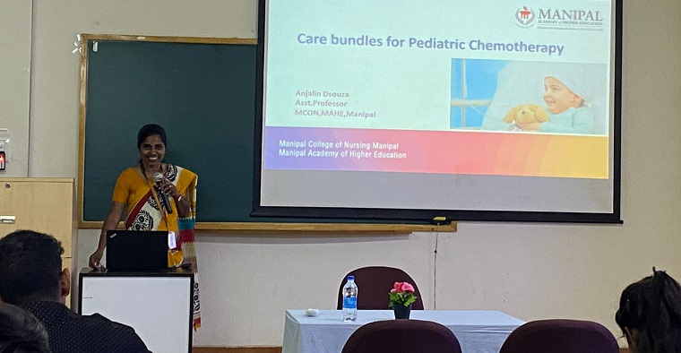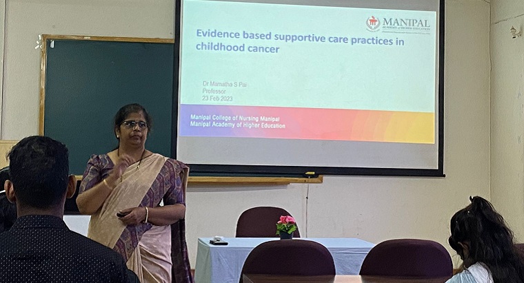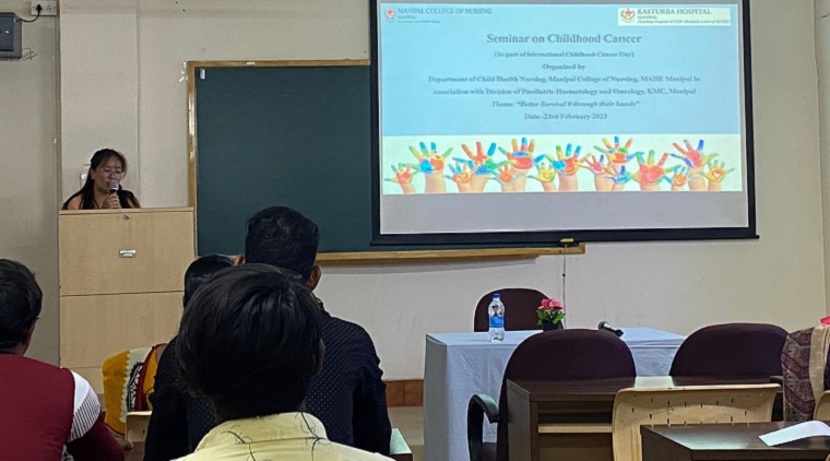 Department of child health nursing, Manipal College of Nursing (MCON), Manipal Academy of Higher Education(MAHE) Manipal organized a seminar on “Childhood Cancer” in association with a division of Pediatric Hematology and Oncology, KMC, Manipal, as part of International Childhood Cancer Day on the theme: “Better survival #through your hands” on 23rd February 2023 between 9 am and 1.00 pm. The resource person for the seminar, Dr. Vasudeva Bhat K, Associate professor, Department of Pediatric hemato oncology (PHO), KMC, Manipal, explained the four major pediatric oncological emergencies, ie. Tumor Lysis Syndrome, Leukocytosis, Febrile neutropenia, and Spinal cord compression. He also emphasized that better care is possible only by teamwork from trained multidisciplinary members, and nurses have a significant role in this. Dr. Archana MV, Assistant professor, Department of PHO, KMC, Manipal, shared the dos and don’ts while giving care to a child with a central line. She briefed on common types of central lines, insertion and maintenance, and the nurse's role in the prevention of central line-associated bloodstream infection. Dr.Anjalin Dsouza, Assistant Professor, department of child health nursing, MCON, MAHE, Manipal, discussed the care bundles on pediatric chemotherapy. Dr. Mamatha S Pai, professor Dept of child health nursing, MCON, Manipal, shared the recent research on evidence-based supportive care practices in childhood cancer. She also highlighted the importance of following clinical Protocols.