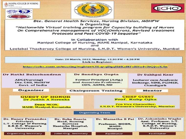 Dte. General Health Services, Nursing Division, MOHFW organized a Nationwide Virtual training program for Capacity building of Nurses On ‘Comprehensive management of VOC(Omicron), Revised treatment Protocols and Post-COVID-19 Sequalae’ in collaboration with Manipal College of Nursing (MCON), Manipal Academy of Higher Education (MAHE), Manipal and Leelabai Thackersey College of Nursing, S.N.D.T. Women’s University, Mumbai on 28 March 2022 from 12.30 pm to 4.30 pm.
