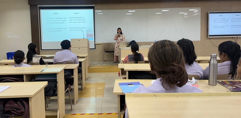 During the session, she highlighted the importance of teaching this technique to young, aspiring nursing students. She emphasized how this cost-effective, non-invasive approach can help mothers and their newborns establish strong bonding, ultimately contributing to improved exclusive breastfeeding rates. This guest lecture was an initiative in alignment with the United Nations’ Sustainable Development Goals- SDG 2 (end hunger, achieve food security and improved nutrition, and promote sustainable agriculture), SDG 3 (ensure healthy lives and promote well-being for all at all ages) and SDG 17 (partnerships for the goals). Overall the aim was to ensure that everyone can lead healthy lives and enjoy well-being, with a special focus on maternal and child health by enhancing breastfeeding practices.