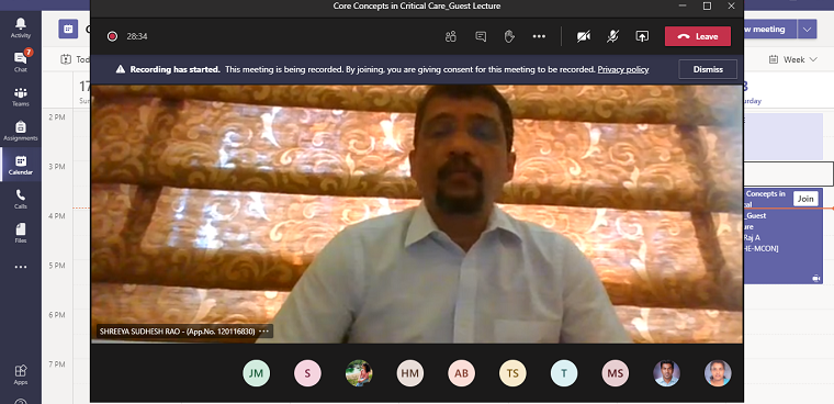 The department of Medical-Surgical Nursing, Manipal College of Nursing, MAHE, Manipal organised a guest lecture on “Core Concepts in Critical Care” on 23rd January 2021 between 4 pm and 5 pm. The guest lecture was delivered by Dr Sudhesh Rao, Consultant Intensivist and Head department of Critical Care, A.J Hospital, Mangaluru to “Nurse Practitioner in Critical Care (NPCC)” students through Microsoft Teams Platform. He elaborated on the history of critical care in India, the types of intensive care units, multidisciplinary and collaborative approach, team dynamics and communication, models of care and classification of critically ill patients. He urged students to have passion in critical care and to be leaders as they belong to the first few batches of the program in India. A total of 12 participants including first year and second year NPCC students and faculty members of the college participated in the session.