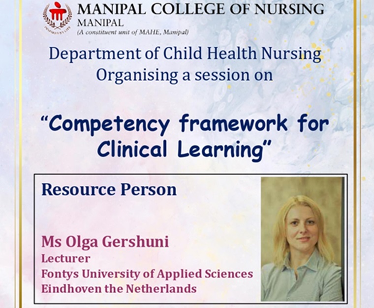 Department of Child Health Nursing, Manipal College of Nursing, MAHE, Manipal, organized a guest lecture on the topic “Competency Framework for Clinical Learning” by Ms OLGA GERSHUNI, Lecturer at Fontys University of Applied Sciences (Eindhoven, the Netherlands), Mental Health Program Director & Strategic Advisor at Health Tech Without Borders Researcher and PhD Candidate at Maastricht University, the Department of International Health (Maastricht, the Netherlands), on March 28, 2024, at 3:00 pm.