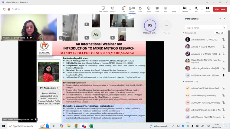 An international webinar was organised on the topic "Introduction to Mixed Method Research (MMR)" by Pillar IV-Alumni Engagement and Relations, Manipal College of Nursing, MAHE, Manipal, on September 11, 2024, between 9.00 am and 12.00 noon. A total of 178 participants (faculty, postgraduate students, and PhD scholars) of nursing, medical, and allied health streams from different parts of the country attended the webinar through the Microsoft Teams platform. The webinar included sessions on topics like an overview of MMR, MMR designs, and analysis of MMR. These sessions were deliberated by Mr Anil Raj, Assistant Professor, Manipal College of Nursing, Dr Anupama D. S., Research Fellow, Dept. of Global Health Governance, Prasanna School of Public Health, MAHE, Manipal; and Dr Sulaiman Al-Sabei, Assistant Dean of Research and Associate Professor, Nursing Administration, Sultan Qaboos University, Oman. The experts gave an overview of the topics with apt examples, making it interesting and interactive for the participants. The webinar was appreciated by the participants and helped to align the goals of Manipal College of Nursing, MAHE towards United Nations SDG #4, "Quality education," by providing an opportunity to its participants for a learning experience. Mrs Flavia S Noronha, Assistant Professor, MCON, welcomed the gathering, Ms. Preejana and Ms. Anjana Sharma, PhD scholars at MCON coordinated the webinar with the guidance of Dr Mamatha S Pai, Professor and Pillar IV Head, MCON.