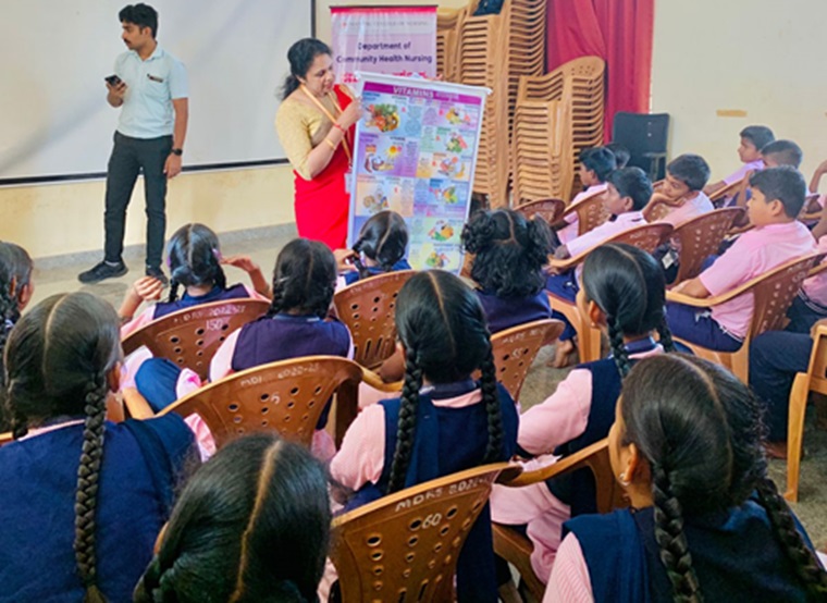 On October 27, 2023, an awareness program on “Adolescent nutrition and health issues” was conducted for the 9th and 10th grade students of Morarji Desai Residency School, Patla, to create awareness on the role of nutrients in growth and development, academic enhancement, and health issues in adolescents. Dr. Ansuya, Assistant Professor-Selection Grade, had an interactive session with students and sensitized them on the importance of a nutritious and balanced diet, the role of nutrition in growth and development, and enhancement in their academics. Also explained were healthy lifestyles to be practiced to grow as healthy and productive citizens for the country. She highlighted adolescent health issues and concerns and their management and prevention. A total of 50 students participated in the program. All students' weight and height were measured, and they were identified as having a nutritional status. IV year BSc Nursing students presented a video on personal hygiene and government schemes helping to prevent anaemia among adolescents. Mr. Nikhil Castelino, IV year BSc Nursing student, welcomed and delivered the vote of thanks to the participants and faculty.