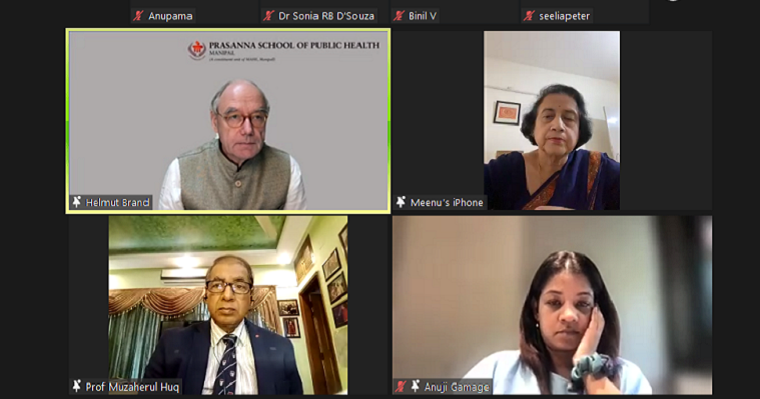 The second day of SPARC funded international conference on 17th March 2022 began with the panel discussion on ‘Importance of indigenizing evidence to local context for informing policy and practice decisions in South Asia’ (Case studies/Examples of indigenizing evidence from South Asian Countries). Speakers from South Asia, Dr Meenu Singh (India) Professor of Paediatrics, Chief Paediatric Pulmonology, Advanced Paediatrics Centre PI: ICMR Advanced Center for research in Evidence-based Child Health Head, Dept. of Telemedicine Postgraduate Institute of Medical Education and Research, Chandigarh, India Dr Rolina Dhital (Nepal) Founder and Chair Health Action and Research Nepal Dr Anuji U Gamage (Sri Lanka) Senior Lecturer/ Consultant Community Physician Paraclinical Department, Faculty of Medicine General Sir John Kotelawala Defence University Sri Lanka and Prof. Muzaherul Huq (Bangladesh) Founding chairman, Public Health Foundation, Bangladesh Former Regional Advisor, WHO, SEARO were the panelists. The panel discussion was moderated by Prof. Helmut Brand, Director Prasanna School of Public Health, MAHE, Manipal.