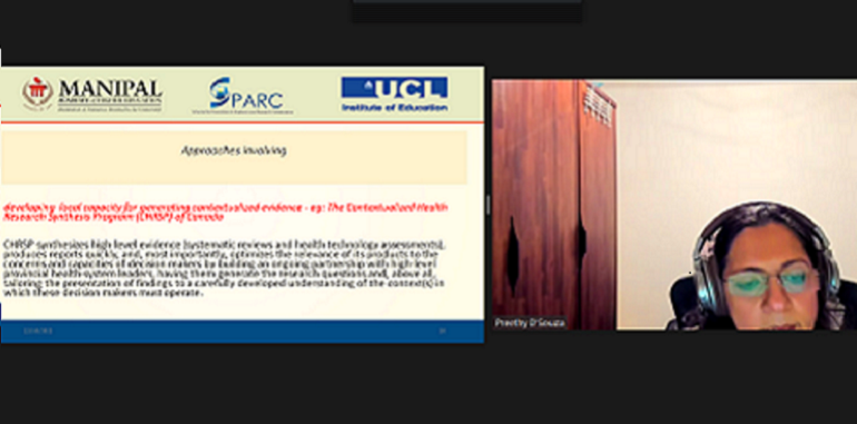 The virtual workshop series on "Evidence synthesis by Systematic Reviews” commenced with a session on Day 1 on ‘Introduction to Systematic Reviews & Steps of systematic review’ by Ms. Tenzin Phagdol, Research Assistant – ICMR funded project, MCON, MAHE. The resource person highlighted the importance of evidence-based practice, types, and importance of systematic reviews and also presented an overview of the steps of the systematic review. The second session of Day 1 focused on “Development of a systematic review protocol and PROSPERO registration” by Mr. Anil Raj, Assistant Professor, Department of Medical-Surgical Nursing, MCON, MAHE. A detailed discussion on how a systematic review protocol can be developed was demonstrated and the steps of registration of a systematic review on PROSPERO were deliberated. The first session on Day 2 focused on “Framing a systematic review question/PICOTS”, which was deliberated by Dr. Sonia R.B D’Souza, Professor and HoD, Department of OBG Nursing, MCON, MAHE, who discussed in detail the PICOTS framework for systematic review. The second session of Day 2 of the virtual workshop was on ‘Formulating a search strategy & Databases’ search including practical sessions’ by Dr. Baby S Nayak, Professor and HoD, Dept. of Child Health Nursing, MCON, MAHE. She discussed in detail how the search strategy needs to be formulated and also demonstrated the steps of searching databases like PubMed Medline and CINAHL among others. The first session of Day 3 was on “Data collection and de-duplication of studies using Rayyan software” which was deliberated by Ms. Prima JJ D’Souza, Assistant Professor, Department of Fundamentals of Nursing, MCON, MAHE. The session included detailed demo sessions on how data collection and de-duplication of studies can be done using the Rayyan software. The day ended with a session on “Selection of studies and Data extraction” by Ms. Anupama DS, Research Fellow, Department of Global health governance, Prasanna School of Public Health (PSPH), MAHE, Manipal. The first session of the fourth day of the virtual workshop series was deliberated by Dr. Edlin Glane Mathias, Research Fellow- Public Health Evidence South Asia, Dept. of Health Information, PSPH, MAHE, Manipal, who spoke on “Quality appraisal of Non-RCTs and Observational studies”, and the next session of the day was dealt by Dr. Judith A Noronha, Professor and Dean, MCON, MAHE on the topic “Quality appraisal of RCTs and Assessing risk of bias (ROB)”, emphasizing the importance of assessing ROB in systematic reviews. The last day of the virtual workshop series dealt with “Quality appraisal of systematic review using AMSTAR 2” deliberated by Dr. Binil V, Associate Professor, Department of Mental Health Nursing, MCON, MAHE, and the final session of the day was taken by Ms. Meena Konsam, Research Scholar, MCON, MAHE on “PRISMA and reporting of Systematic Review”, where the updated version of PRISMA was discussed in detail. A total of 78 participants participated in the workshop series and we received very good feedback for all the sessions of the workshop. Participants in their feedback also appreciated the virtual workshop and expressed their wish to have more similar workshops conducted by Manipal College of Nursing Manipal in the future.