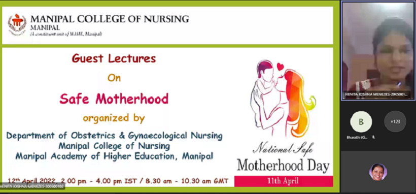 Department of Obstetrics & Gynecological Nursing, Manipal College of Nursing, Manipal Academy of Higher Education organized one-day guest lecture series conducted virtually as a part of the Safe Motherhood 2022 celebration through the Microsoft teams platform. The session began at 2 pm, and around 160 participants attended the session. The moderator welcomed the participants and introduced Dr Shashikala Bhat, the speaker for the first session.