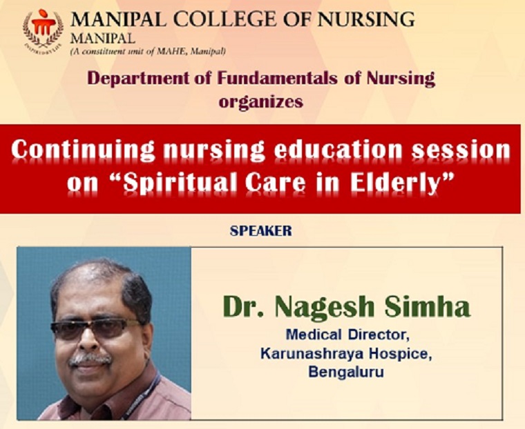 A continuing nursing education session on “Spiritual care in Elderly" by Dr. Nagesh Simha, Medical Director, Karunashraya Hospice, Bengaluru was organized by the Department of Fundamentals of Nursing, MCON, MAHE Manipal through MS teams’ online platform on the 3rd September 2022 between 2.00 & 3.00 pm.