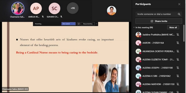 Manipal College of Nursing, MAHE, Manipal organized a session on “Care & Affection” as part of the student induction programme (Deeksharambh) on 05.10.2021 through Microsoft Teams for the first year BSc Nursing students (2021-22 batch).