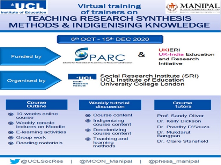In light of travel constraints imposed as a result of the COVID-19 pandemic, planned face-to-face discussions by the UK academics, during their visit to MAHE in May 2020, as a part of SPARC funded project titled ‘Indigenizing evidence synthesis and systematic reviews for international development and global challenges’, were replaced with two online courses which ran in parallel for ten weeks from 6th October 2020 to 15th December 2020.