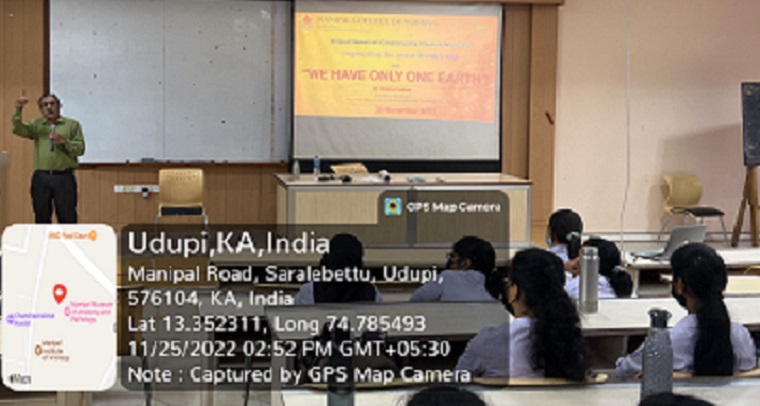 A guest lecture also was organized for the students of Manipal College of Nursing on the topic of “WE HAVE ONLY ONE EARTH” on 25-11-2022. The resource person for the program was Dr. Krishna Kothai, Emeritus Professor, Poornaprajna Centre for Research and Development, Udupi.