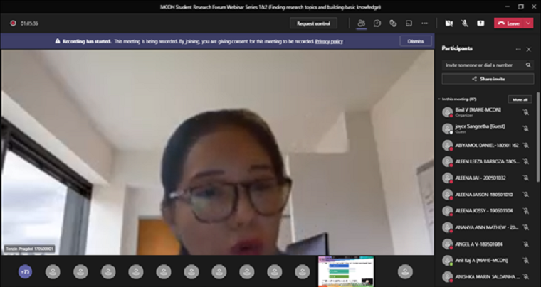 The Student Research Forum of Manipal College of Nursing (MCON), MAHE, Manipal organized a webinar on “Inculcating Research Culture in Students”. The first two sessions of the year-long webinar series were held on 17 July 2021 from 3.00 pm to 5.00 pm. The target audience were the undergraduate & postgraduate students, PhD Scholars, and Project Staff of MCON, MAHE, Manipal. Dr Binil V, Associate Professor, Department of Psychiatric (Mental Health) Nursing, MCON, and Faculty Advisor of SRF-MCON addressed the participants and briefed the objectives of SRF-MCON. He also spoke on the importance of the webinar series. Ms. Tenzin Phagdol, PhD. Scholar, Department of Child Health Nursing, MCON, Manipal discussed the basic steps in a research process and Mr Anil Raj A, Lecturer, Department of Medical-Surgical Nursing, MCON, Manipal took a session on finding research topics and building basic knowledge. Both the sessions were interesting and were highly appreciated by the participants. A total of 90 participants attended the webinar sessions. E-certificate was given to the participants.