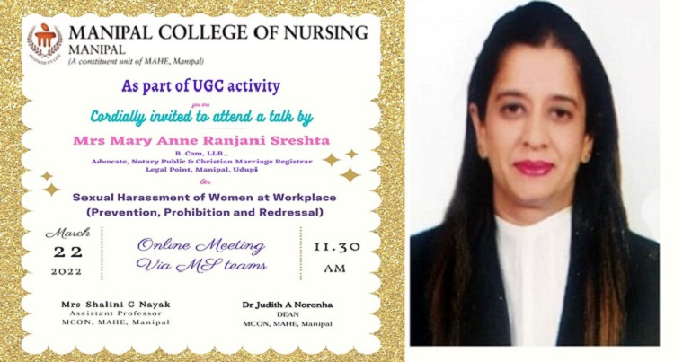 Manipal College of Nursing, MAHE, Manipal has organized a webinar on the topic “Sexual Harassment of Women at Workplace” (Prevention, Prohibition and Redressal), on March 22, 2022, between 11.30 am and 12.30 noon. Mrs, Mary Anne Ranjani Shresta, Advocate, Notary Public and Christian Marriage Registrar, Legal Point, Manipal, Udupi shared her expertise on the topic. She highlighted the laws and guidelines to protect women, the different physical, verbal and nonverbal forms of sexual harassment at the workplace, various committees and their roles, inquiry into complaints and inquiry reports. The details of the acts available to address also were discussed by her. She also threw light on the duties of the various district officer and liability for non-compliance to the act. She empowered the participants by suggesting the different ways that can be followed by the women at the workplace to prevent and stop sexual harassment.
