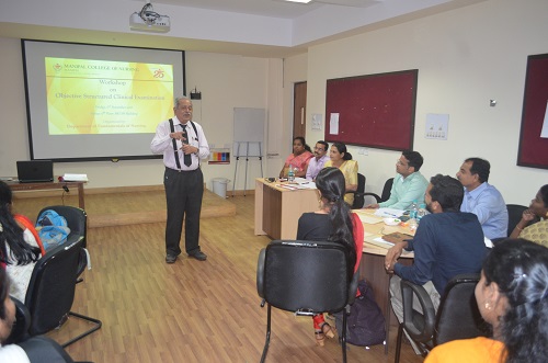 The objectives of the workshop were to appreciate and familiarize the OSCE technique as a method of assessment as well as to develop skill in conducting OSCE. The workshop was attended by 23 participants from MAHE and from some other nursing institutions. The workshop was formally inducted by Dr. Christopher Sudhakar, Director Quality, Manipal Academy of Higher Education Manipal. In his key note address he emphasized the importance of conducting OSCE for educator and impact on student performance. He briefed about the workshop and the various other sessions involved.