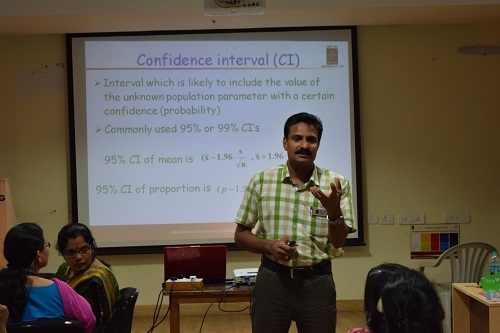 The last session in the morning was on ‘Classification of RCTs’ which was covered by Mr. Nageshwar and Ms.Renu, PhD scholars of MCON Manipal. The afternoon session started with ‘Bias in RCTs’ by Mr. Aldrin Vas, PhD Scholar and the session was moderated by Dr. Judith A Noronha, Associate Dean, MCON Manipal. Dr. Judith reinforced on the need of avoiding selection bias and how to report the findings. The next session was on ‘Analysis of RCTs’ by Dr. Binu V S, Associate Professor, Department of statistics, Manipal Academy of Higher Education. He explained analysis of RCTs with problem solving exercises.