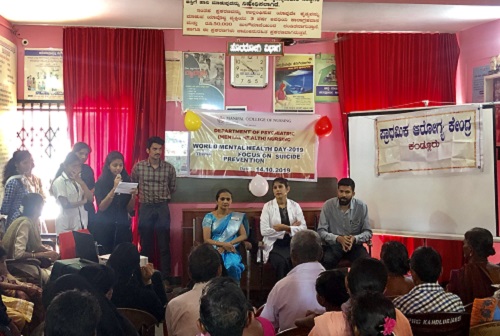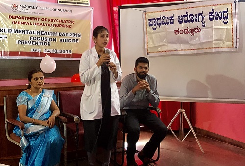 Health awareness program on promotion of mental health and prevention of suicide was conducted on 14.10.2019 for rural population of Kandlur Panchayat. Dr. Latha, Medial Officer, Kandlur PHC presided over the program. She informed the gathering to make use of mental health facilities available at PHC. Mr. Praveen A, Lecturer, KMC, Manipal explained about the theme of World Mental Health day. Mrs. Savitha, Assistant Professor, MCON, Manipal briefed on suicide prevention.