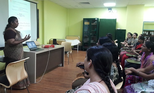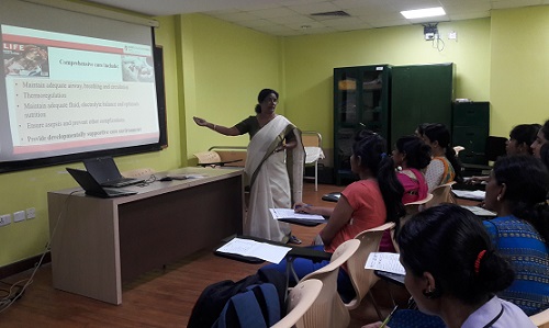 A training session for 40 staff nurses of Neonatal Intensive Care Unit (NICU) on comprehensive care of preterm babies was conducted by Mrs Yashoda, Assistant Professor, Department of Child Health Nursing on 11th and 15th November 2019. She emphasized on maintenance of airway, breathing, circulation, thermoregulation, prevention of infection, nutrition, fluid and electrolyte balance and developmental supportive care.