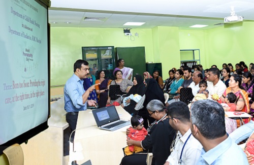 Dr Leslie Lewis, Head of Neonatology, Department of Pediatrics, KMC, Manipal deliberated on this year’s theme, “Born Too Soon: Providing the right care, at the right time, in the right place” on 18th November 2019. The session was attended by 60 health care professionals. In his talk, he briefed about the Golden Minute which involves stimulating the baby, positioning and suctioning the airway and assessment and ventilation of babies to help the babies breathe. He also emphasized on high quality care for intact survival of extremely premature infants and blend of technology with humanized care promotes optimum growth and development of the premature babies.