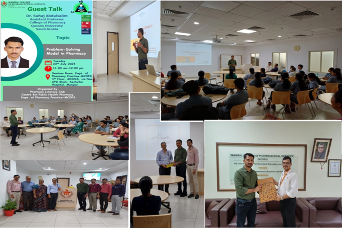 Dr. Suhaj Abdulsalim, Assistant Professor, College of Pharmacy, Qassim University, Saudi Arabia, delivered a guest talk on "Problem-Solving Model in Pharmacy" on the 23 July 2024 from 11:30 AM at Dept. of Pharmacy Practice-MCOPS, Kasturba Hospital, Manipal. He is a faculty alumnus of MCOPS from 2012 to 2016. During the talk, Dr. Suhaj said, “Making decisions and solving problems are critical responsibilities of all pharmacists, whether they are managers/leaders or staff members.” He shared his professional experience as an international academic pharmacist and motivated students to practice problem-based learning. During his talk, he discussed different problem models, barriers to good problem-solving and decision-making, and steps in problem-solving. The event was organized by the Pharmacy Literacy Club (PLC), Centre for Public Health Pharmacy, Dept. of Pharmacy Practice, MCOPS.