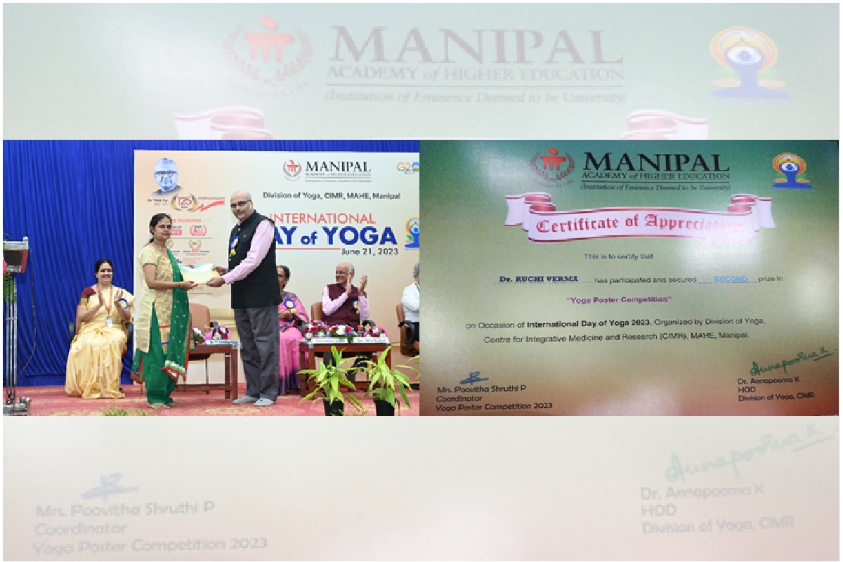 Dr Ruchi Verma, Assistant Professor-Selection Grade, Department of Pharmaceutical Chemistry, MCOPS, MAHE, Manipal received second prize in the “Yoga Poster Competition” on the occasion of International Day of Yoga 2023, organized by Division of Yoga, Centre for Integrative Medicine and Research (ICMR), MAHE, Manipal.